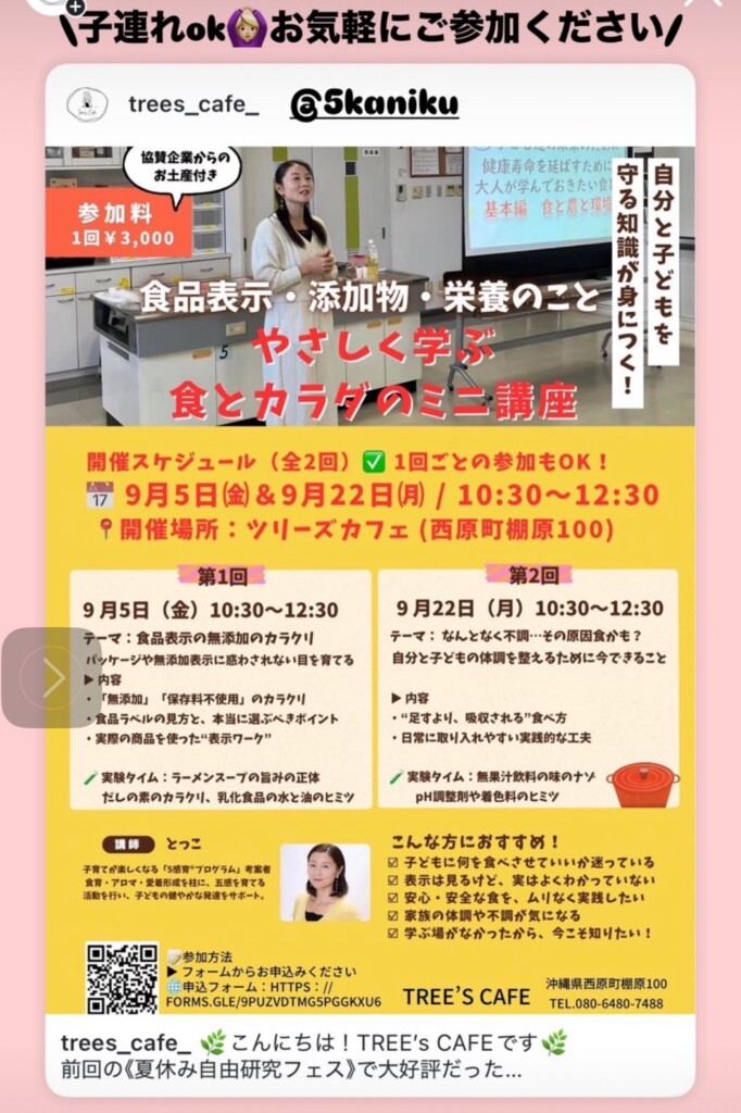 次回は 22日、西原町棚原100番地 ツリーズカフェ